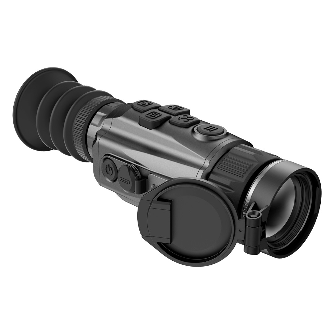 Zaawansowany sensor 256×192 o małym rozmiarze piksela (12 µm), w połączeniu z jasnym obiektywem 25 mm, dostarcza obraz o niezwykłej szczegółowości cieplnej. Płynne odświeżanie na poziomie 50 Hz całkowicie zapobiega smużeniu podczas śledzenia szybko poruszającego się celu, a optymalne pole widzenia 7° ułatwia skanowanie otoczenia. Dzięki temu celownik oferuje imponujący zasięg detekcji sięgający 1300 metrów, pozwalając na pewną identyfikację sylwetki i oddanie w pełni bezpiecznego, etycznego strzału.