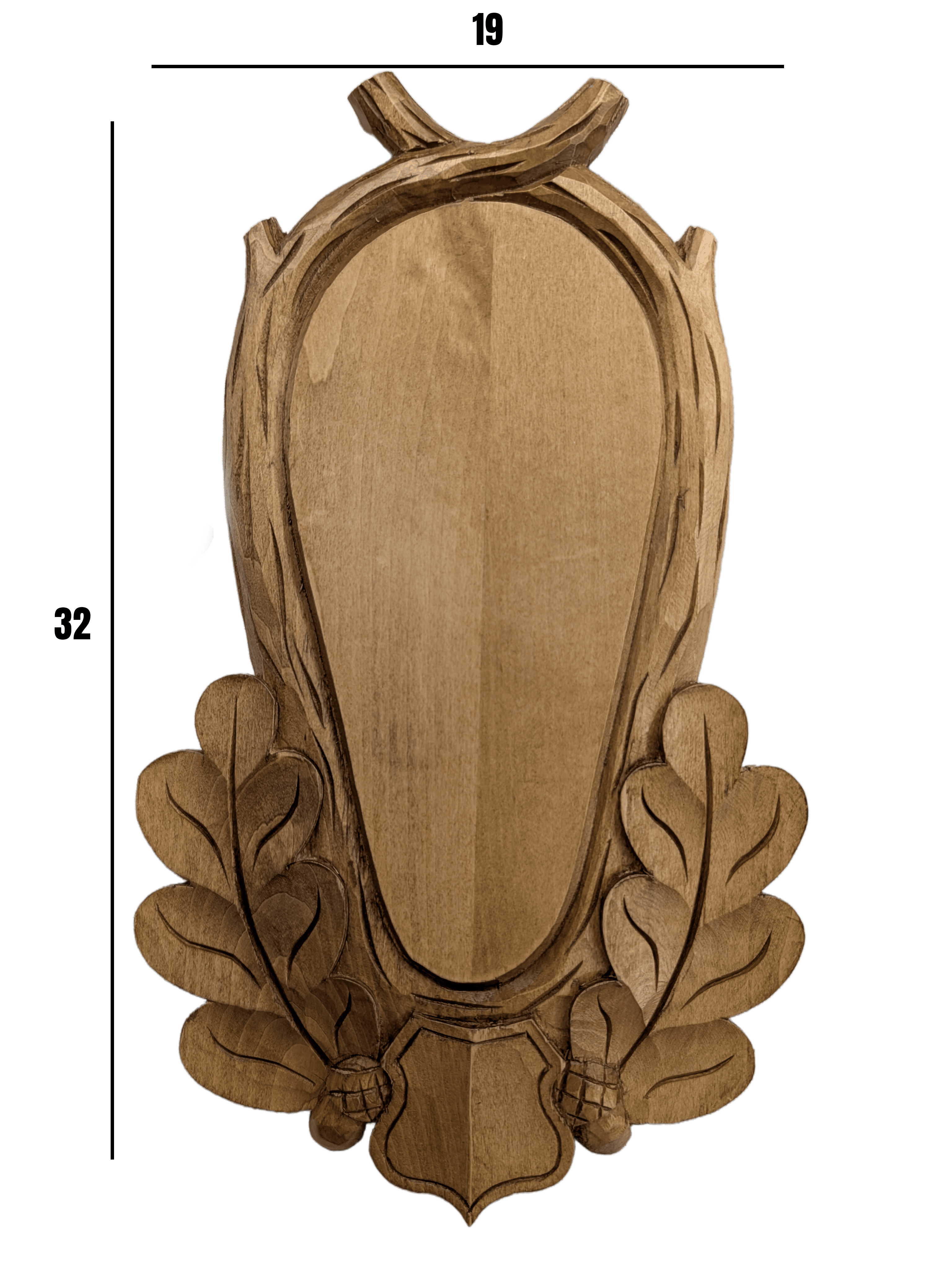 Stylowa i solidna deska pod trofeum rogacza o owalnym kształcie, wykonana z dbałością o każdy detal. Jej ciemne wybarwienie nadaje elegancji, a bogate zdobienia w postaci rzeźbionych gałęzi, liści i orzecha wprowadzają naturalny, rustykalny klimat. Idealna do wyeksponowania trofeum w domu, myśliwskiej chacie lub gabinecie.