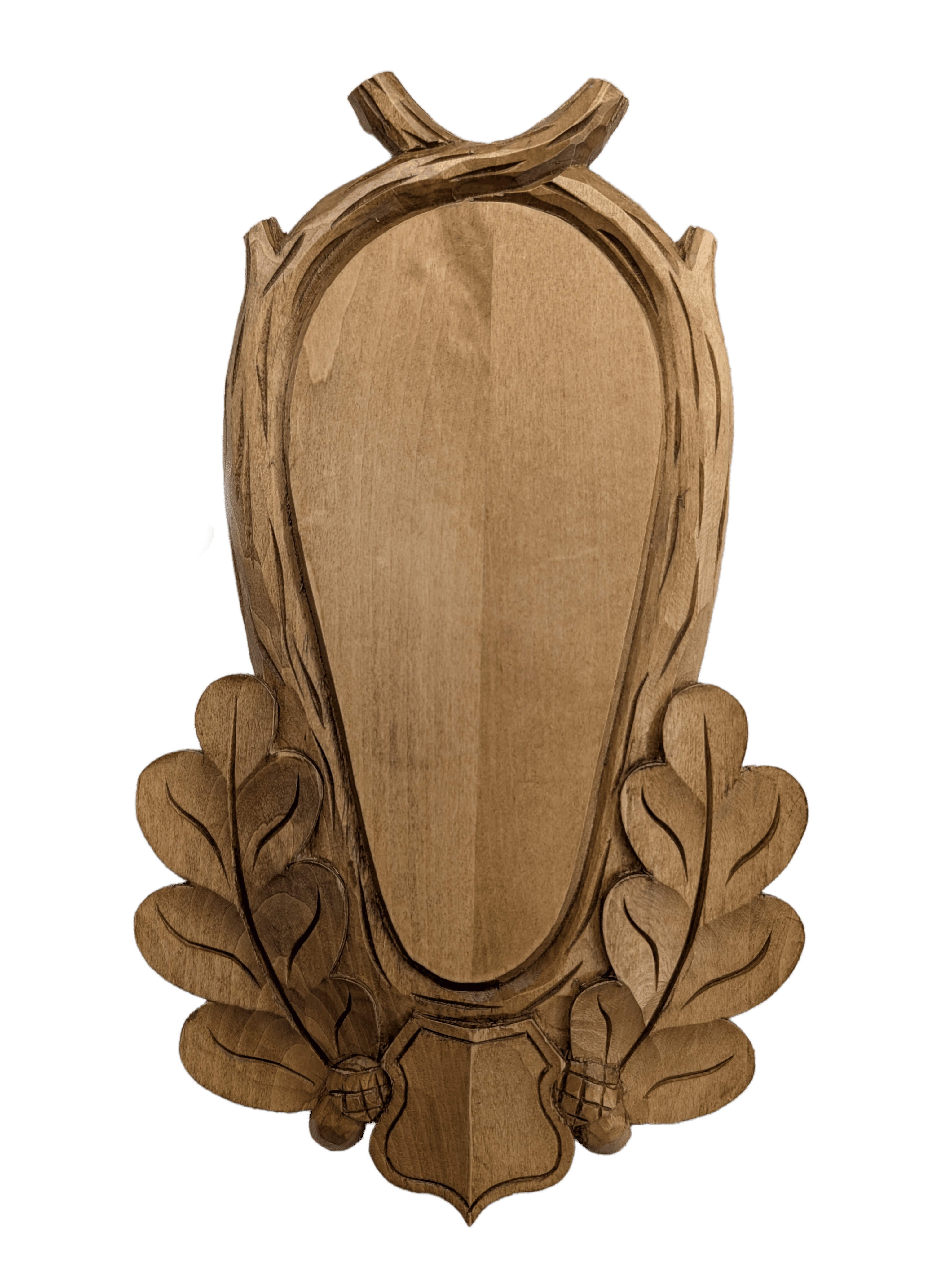 Deska pod trofeum rogacza – owalna, rzeźbiona, ciemne wybarwienie