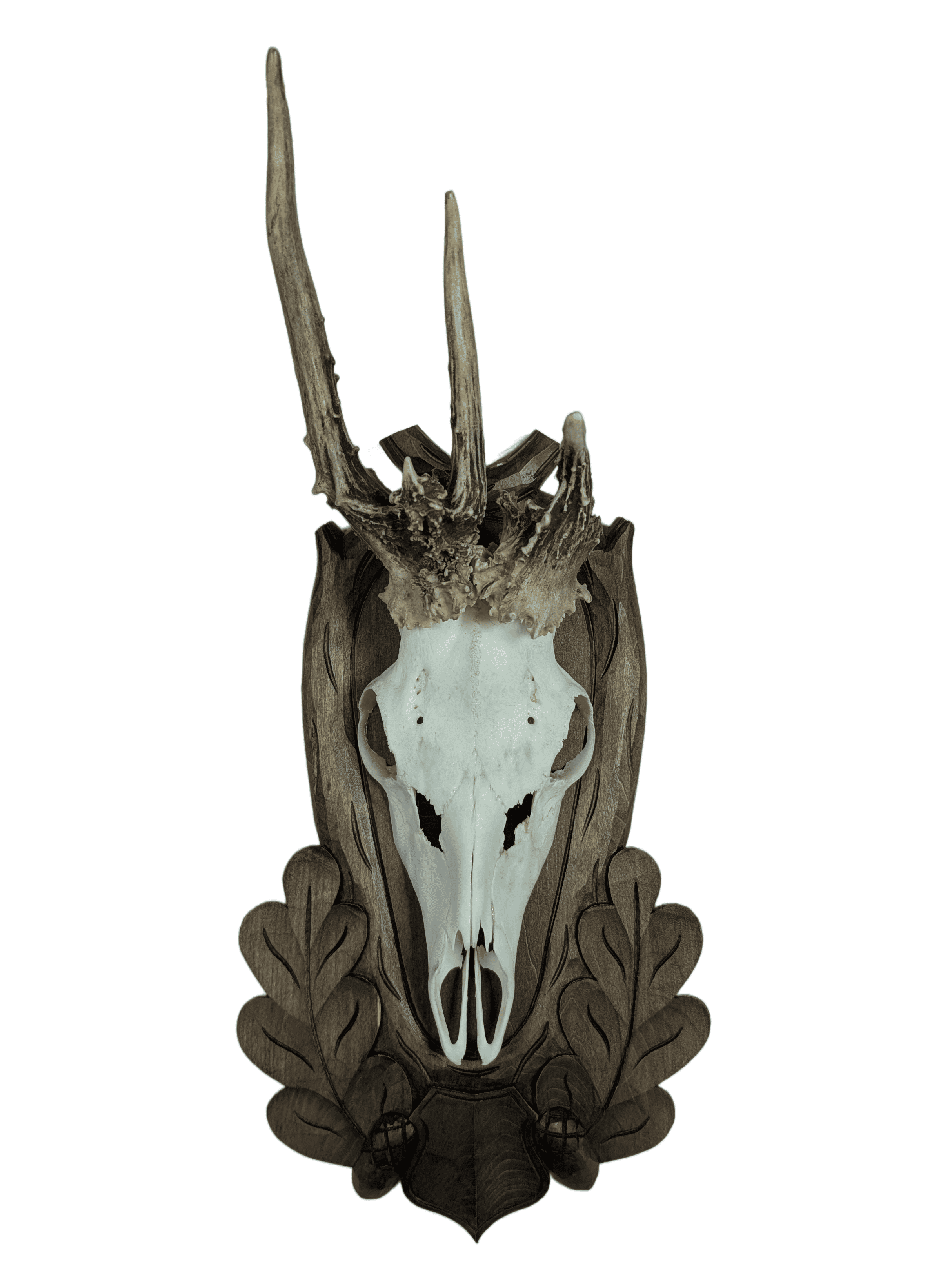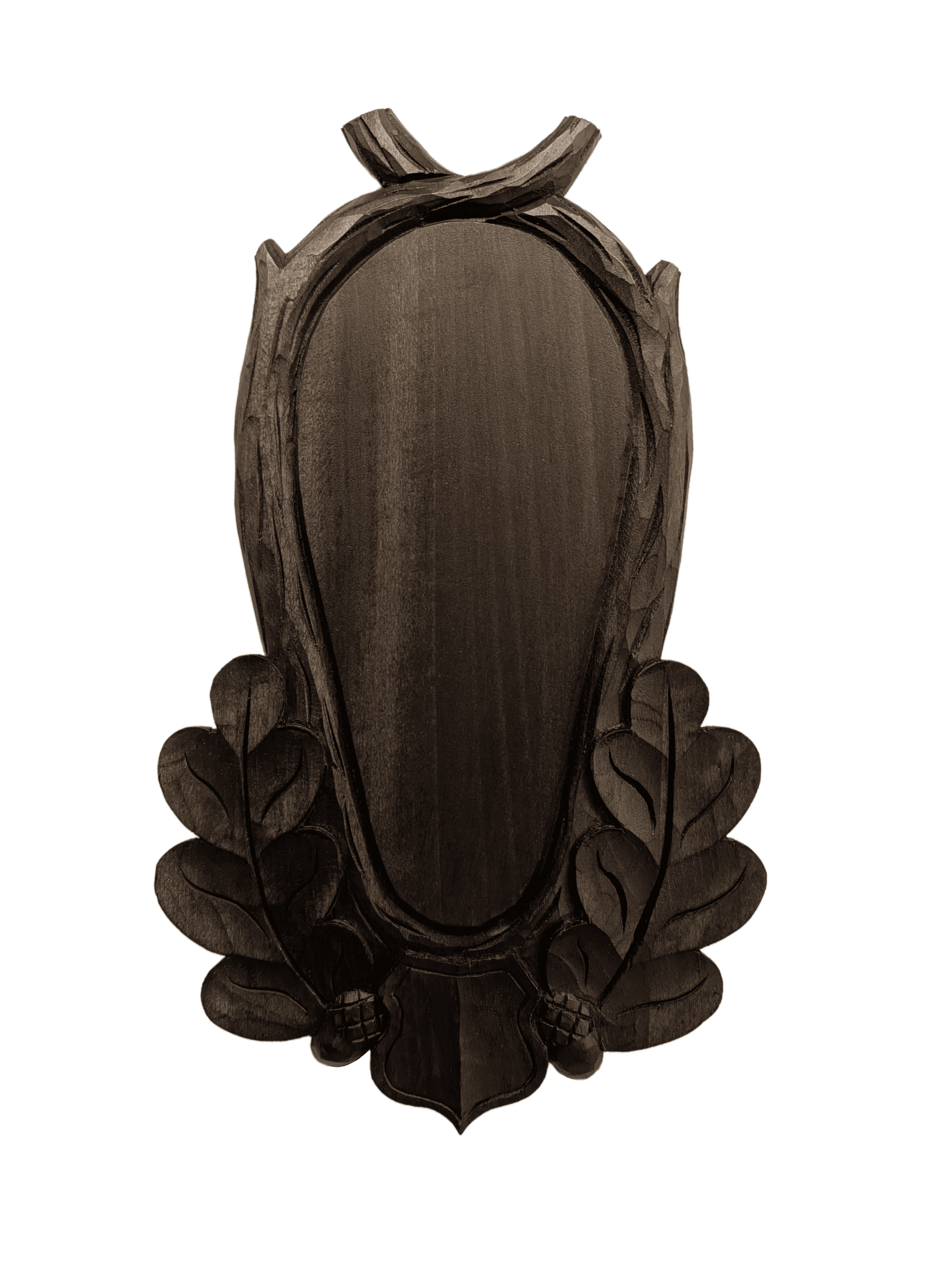 Stylowa i solidna deska pod trofeum rogacza o owalnym kształcie, wykonana z dbałością o każdy detal. Jej ciemne wybarwienie nadaje elegancji, a bogate zdobienia w postaci rzeźbionych gałęzi, liści i orzecha wprowadzają naturalny, rustykalny klimat. Idealna do wyeksponowania trofeum w domu, myśliwskiej chacie lub gabinecie.