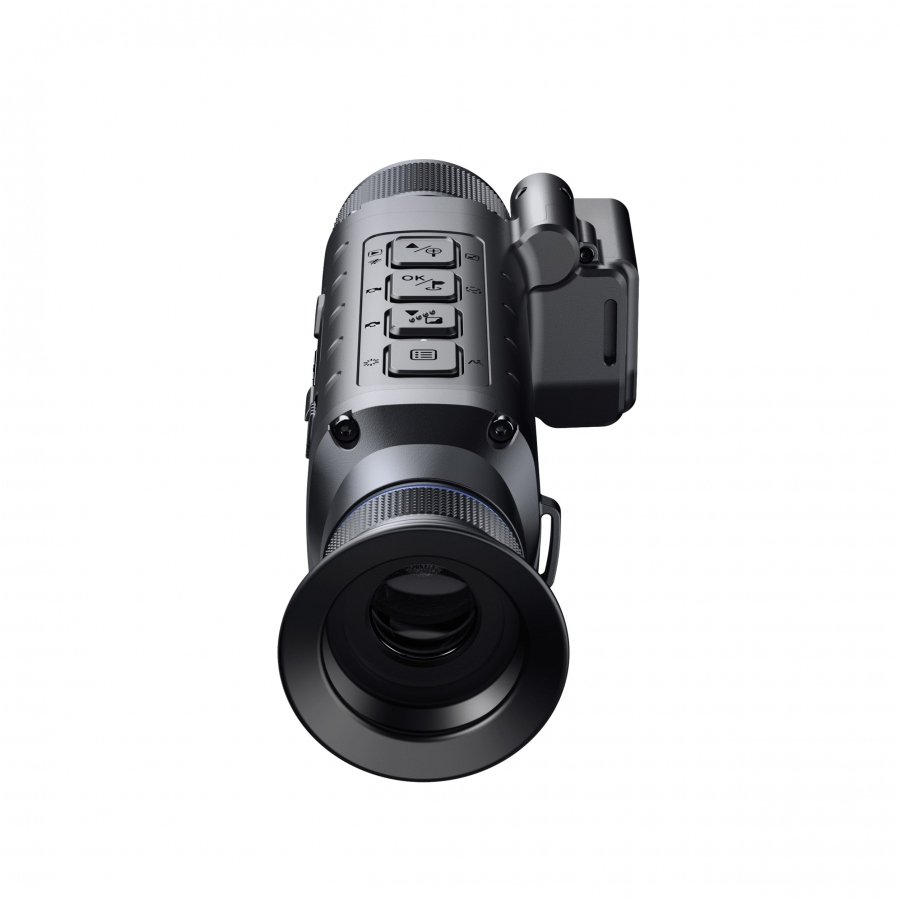 Zastosowanie obiektywu o ogniskowej 25 mm w połączeniu z sensorem VOx 480x360 pikseli o wysokiej czułości (< 20 mK) gwarantuje bardzo szerokie pole widzenia wynoszące aż 13,1 stopnia. W praktyce terenowej oznacza to łatwiejsze namierzenie zwierzyny na krótszych dystansach i szybszą reakcję na dynamicznie przemieszczające się cele, np. watahę dzików. Algorytmy obrazu radzą sobie w absolutnych ciemnościach, skutecznie odcinając sylwetkę od tła nawet podczas intensywnych opadów deszczu czy śniegu.
