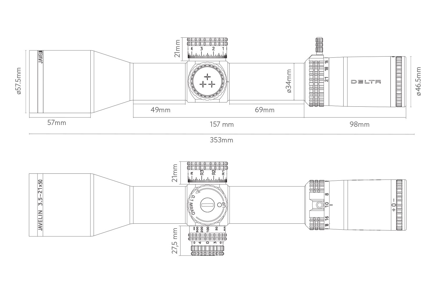 Jako wydajna luneta na średni i długi dystans, Delta Javelin bazuje na wysokiej jakości szkłach ED, które skutecznie ograniczają aberrację chromatyczną i gwarantują wysoki kontrast. Obiektyw o średnicy 50 mm ułatwia celowanie we wczesnych godzinach porannych lub podczas wieczornych zawodów. Właściwe rozpoznanie celu ułatwia również boczna regulacja paralaksy działająca od 10 metrów oraz podświetlany centralny punkt celowniczy.