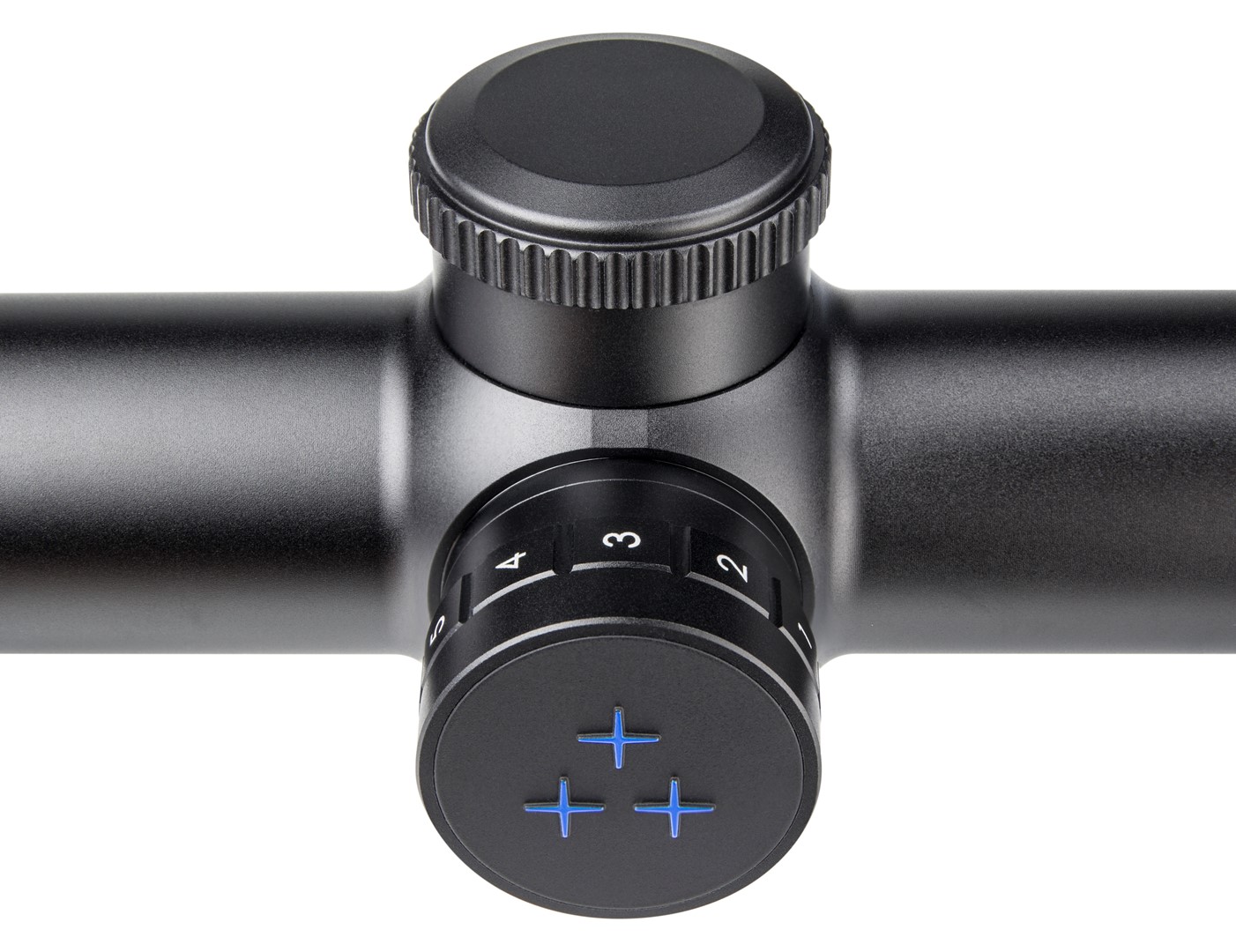 W celowniku zastosowano sprawdzoną i popularną siatkę 4A S z podświetlanym punktem, wyposażoną w tryby pracy dziennej i nocnej. Cienkie linie krzyża pozwalają na dokładne zgranie lufy z punktem trafienia, bez zasłaniania małych celów czy istotnych detali sylwetki dzika. Mechanizmy ukryte pod zakrytymi wieżyczkami pracują w czytelnym systemie metrycznym, gdzie jeden klik odpowiada wartości 0,1 MRAD, co ułatwia ewentualne zerowanie i kalkulacje na tarczy.