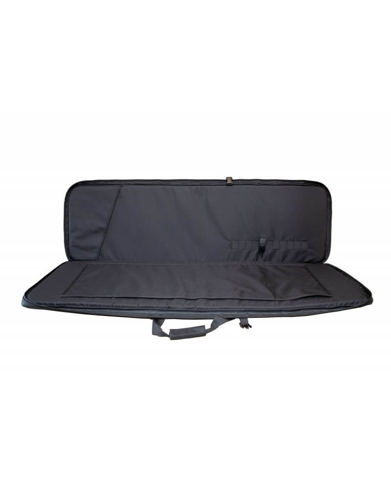 Pokrowiec oferuje wiele kieszeni, zarówno wewnętrznych, jak i zewnętrznych, co pozwala na łatwe przechowywanie amunicji oraz akcesoriów strzeleckich. Wewnątrz znajduje się zamykana na rzep kieszeń, a na zewnątrz trzy dodatkowe kieszenie zapinane na suwaki.