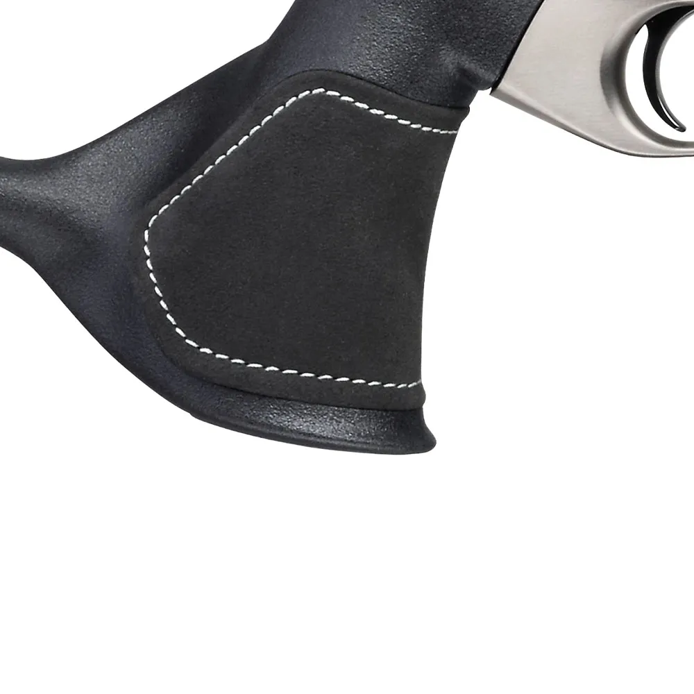 Model Silverstone wyróżnia się na tle innych sztucerów designerskim połączeniem czarnej, wytrzymałej osady syntetycznej z wstawkami z szarej skóry zamszowej. Materiał ten, umieszczony na chwycie pistoletowym, przednim łożu i bace, zapewnia nie tylko ekskluzywny wygląd, ale przede wszystkim stabilny i ciepły chwyt. Dodatkowo, regulowana baka pozwala na idealne dopasowanie wysokości policzka do osi optycznej lunety, co jest kluczowe dla szybkiego i powtarzalnego składu, zwłaszcza podczas dynamicznych polowań.