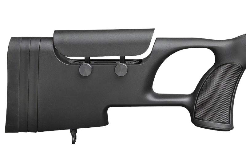 Osada typu „thumbhole” została wykonana z wytrzymałego polimeru wzmocnionego włóknem szklanym, co sprawia, że jest odporna na wilgoć i doskonale tłumi wibracje. Wyposażono ją w regulowaną wysokość baki policzkowej, co pozwala na idealne zgranie oka z osią optyczną lunety niezależnie od wielkości zamontowanego obiektywu. Gumowa stopka z systemem dystansów skutecznie amortyzuje odrzut, chroniąc bark strzelca przy użyciu mocnej amunicji i pozwalając na oddanie serii precyzyjnych strzałów bez dyskomfortu.