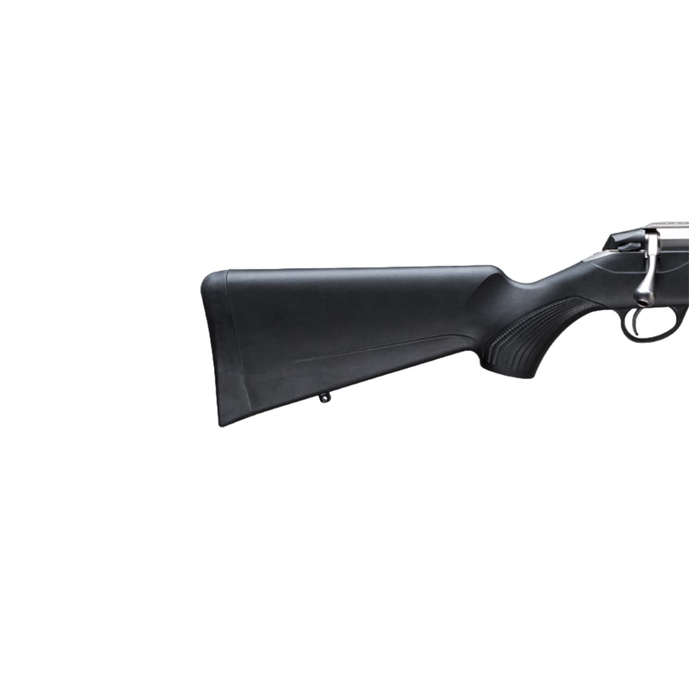 Niska waga wymaga doskonałej kontroli. Sztucer wyposażono w udoskonaloną, syntetyczną osadę z asymetryczną, antypoślizgową fakturą na chwycie i czółenku, co zapewnia pewne trzymanie broni nawet w mokrych rękawicach. Modułowość systemu T3x pozwala na łatwą wymianę nakładek chwytu pistoletowego, dzięki czemu strzelec może dostosować kąt nachylenia chwytu do własnych preferencji i stylu strzelania. Całość dopełnia miękka, wydajna stopka, która świetnie amortyzuje odrzut najmocniejszych kalibrów.