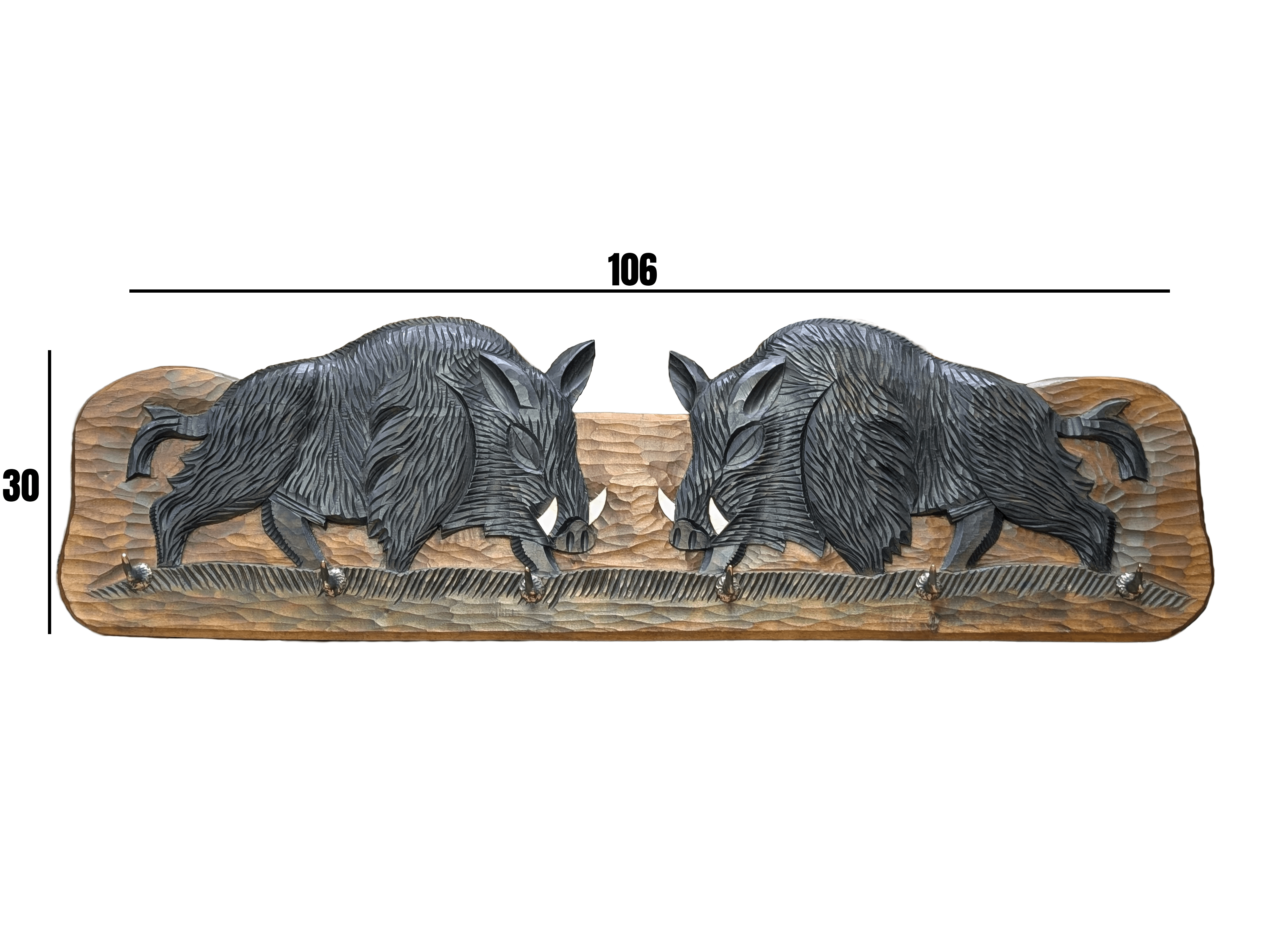 Wyjątkowy, ręcznie rzeźbiony drewniany wieszak, który łączy w sobie funkcjonalność i sztukę. Ozdobiony wizerunkiem dwóch dzików, emanuje rustykalnym urokiem i przypomina o pięknie dzikiej natury. Wykonany przez doświadczonych rzemieślników, zachwyca dopracowanymi detalami – od realistycznych kłów i faktury sierści po perfekcyjne wykończenie drewna.