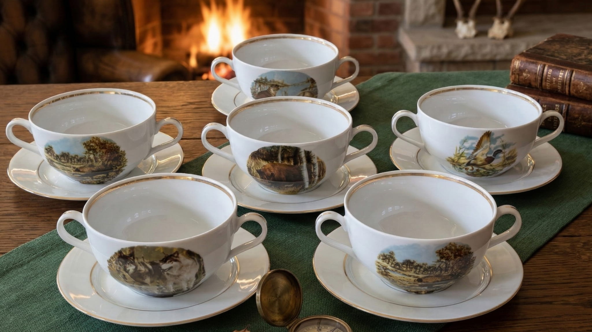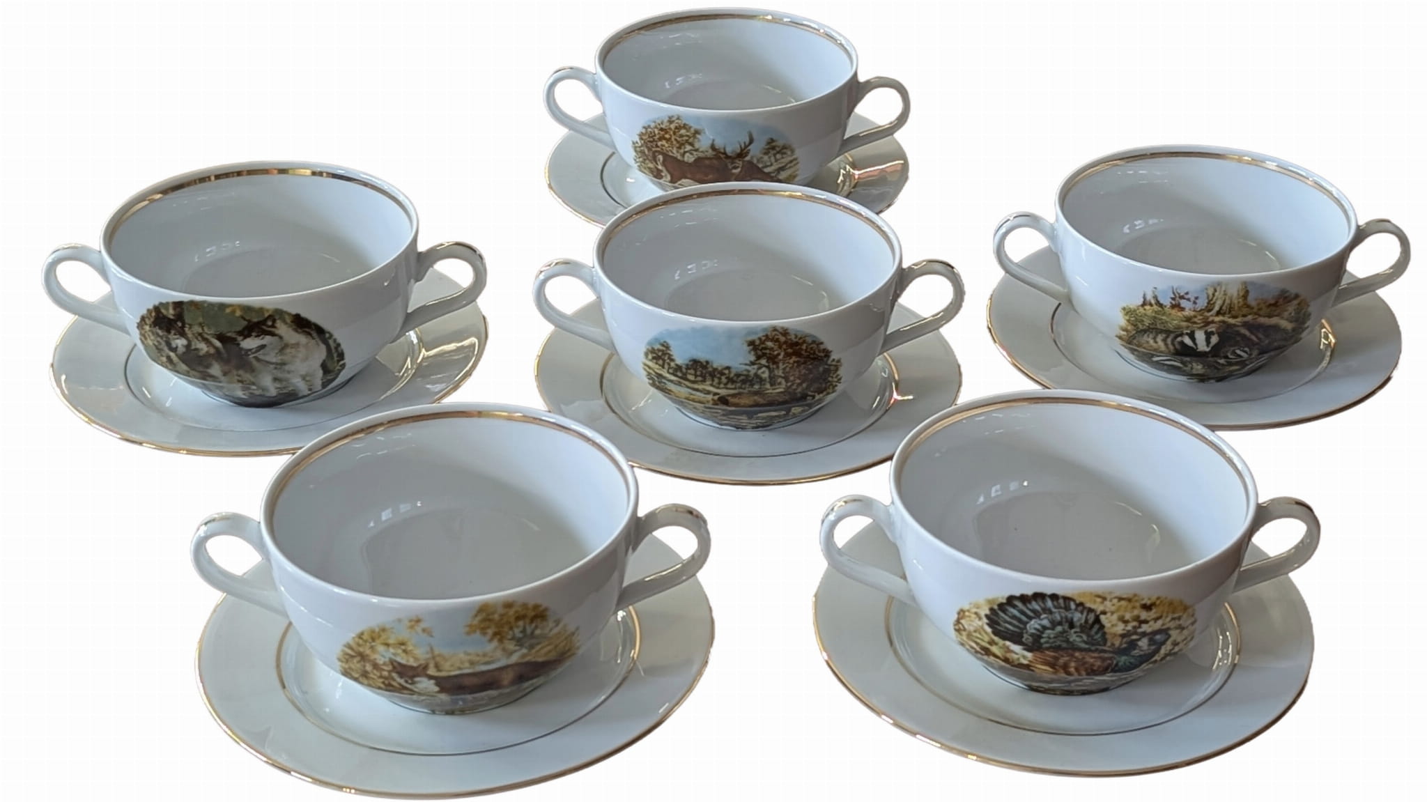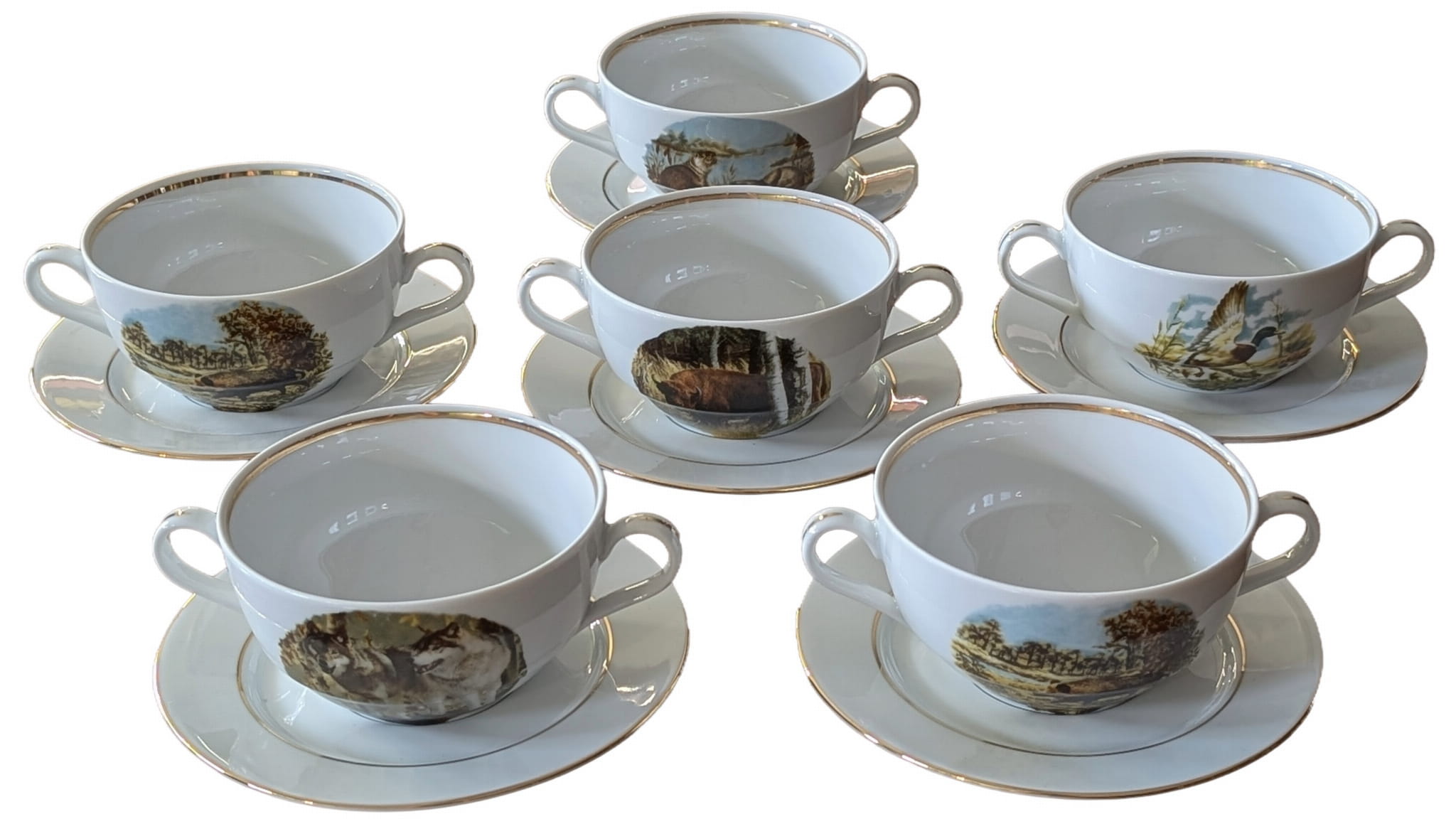 Zestaw 6 porcelanowych bulionówek z podstawkami Chodzież – Motyw Myśliwski